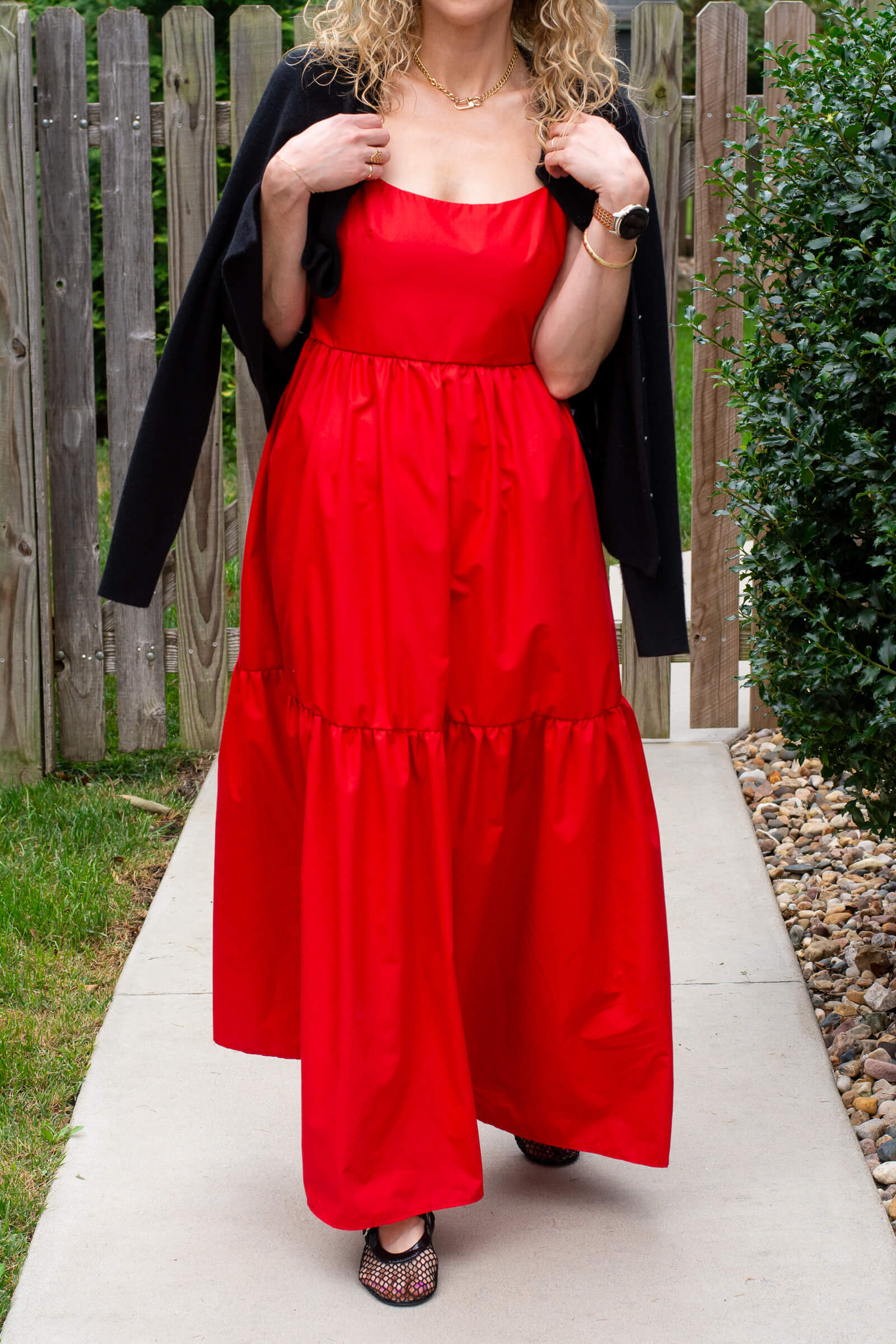 Hinting at fall with a red poplin maxi dress and a cashmere cardigan.